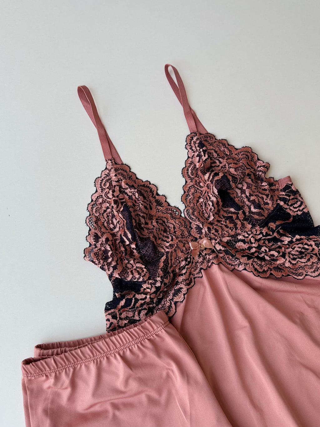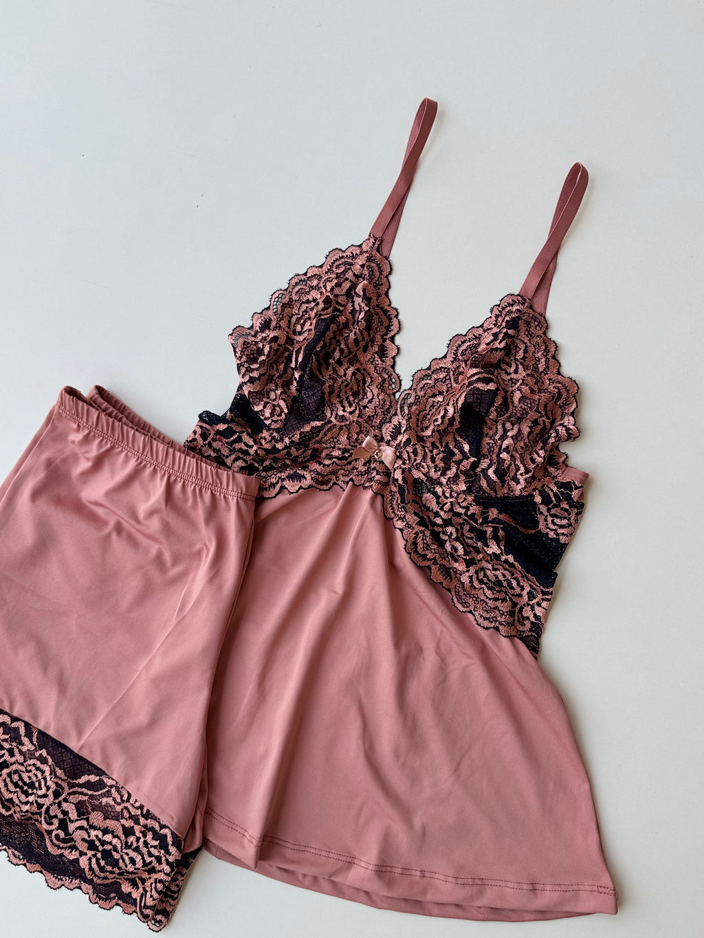 Gli shorts completano il completo con una linea morbida e applicazione in pizzo sull’orlo, garantendo una vestibilità leggera e confortevole. Un completo pensato per offrire benessere e leggerezza al momento di dormire, unendo delicatezza e praticità nella quotidianità.